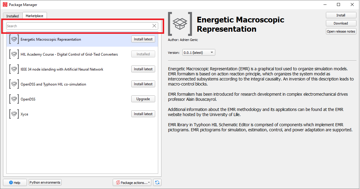 When the Marketplace tab is active, you can use the search input field to filter available packages by their name.