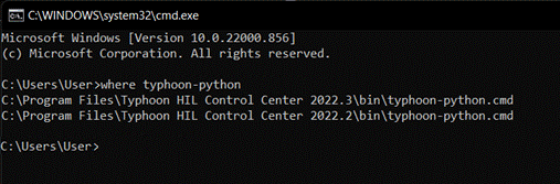 If more than one Typhoon HIL Control Center version is installed you can check which folders the command typhoon-python can be located typing on Command Prompt: