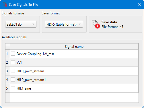 Figure 2. Signal Data Saving dialog with the selected signals option selected