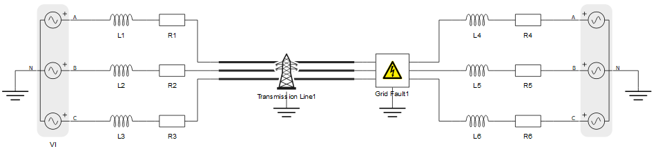 Consider the default, multi-line representation of a model in Figure 1. A single-line version of each multi-phase component can be created by adding the original component to a subsystem, connecting the original terminals to an Electrical Bus, and finally connecting the multi_dim terminal of the Electrical Bus to a Port.