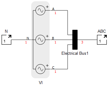 For the Figure 2, the A, B and C terminals of the Three-Phase Source component are connected to an Electrical Bus of bus_size = 3, and its multidimensional terminal is connected to a new port called ABC. The numbers in red are the resulting dimension of the terminals.