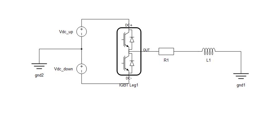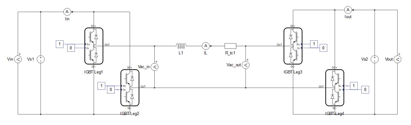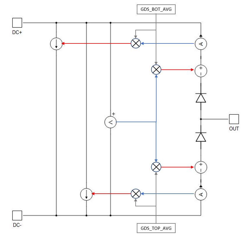 - The converter receives information about duty cycles of the gate drive signals, and then this information is used to calculate the converter’s output. The converter is modelled using controlled voltage and current sources. Figure 2 shows the model of a Half Bridge component which uses Switch-Level GDS oversampling. Voltage and current sources are controlled by average GDS duty cycles. Since averaging is done at the simulation step level and the simulation step period is small in comparison to the PWM period, the switching ripple will be preserved. Since diodes are present in the model, the component supports discontinuous conduction mode.