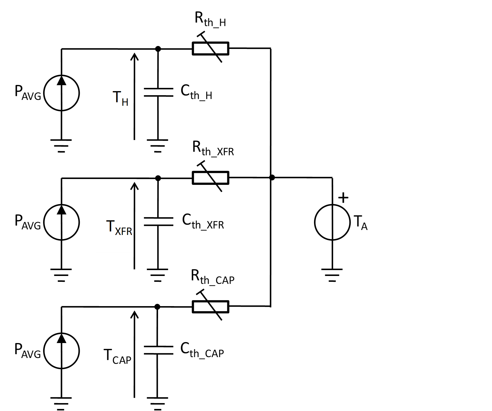 Parameters of the model include the thermal impedances junction to case, and , case to heat sink, and , heat sink to ambient, (the common heat sink for the whole PESB is assumed), and ambient temperature, . Each of thermal impedances comprises of two parameters: thermal resistance and a thermal time constant:
