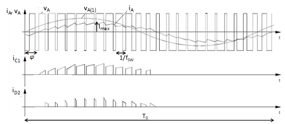 The method of loss calculation given in this document comes from the application notes of the two biggest manufacturers of power electronic switching components - ABB [1] and Semikron [2]. It is based on averaged computation of the conduction and switching losses over one period, , of the output frequency. The approach is applicable for single-phase or three-phase voltage source inverters using naturally sampled pulse-width modulation (PWM) and with sinusoidal output currents. Therefore, it is also fully applicable for grid connected applications and motor drive applications. Required data for the power electronics (PE) components are derived from their datasheets.