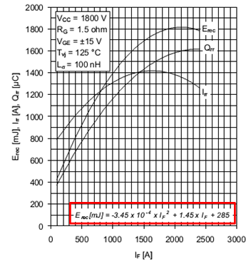 where is the diode's forward threshold voltage and is the diode's forward slope resistance. Energy loss when turning on the diode can be neglected. Energy during turn-off is expressed by the reverse recovery energy, , which is available in the polynomial form as a function of the forward current (see figure below):