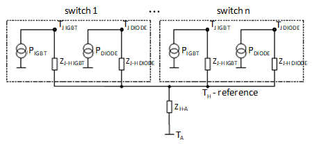 A model of a PESB without a baseplate does not include separate and impedances (the same is valid for diodes) since the junction is directly placed onto the heat sink. Instead, there would be two given thermal impedance junctions to the heat sink, and .