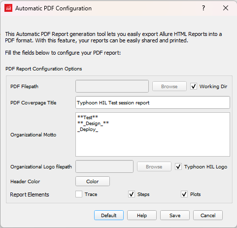 | Organizational Logo filepath | Location for the logo on the report header. If the Typhoon HIL Logo checkbox is selected the default Typhoon logo will be printed in the report. | ![]() |