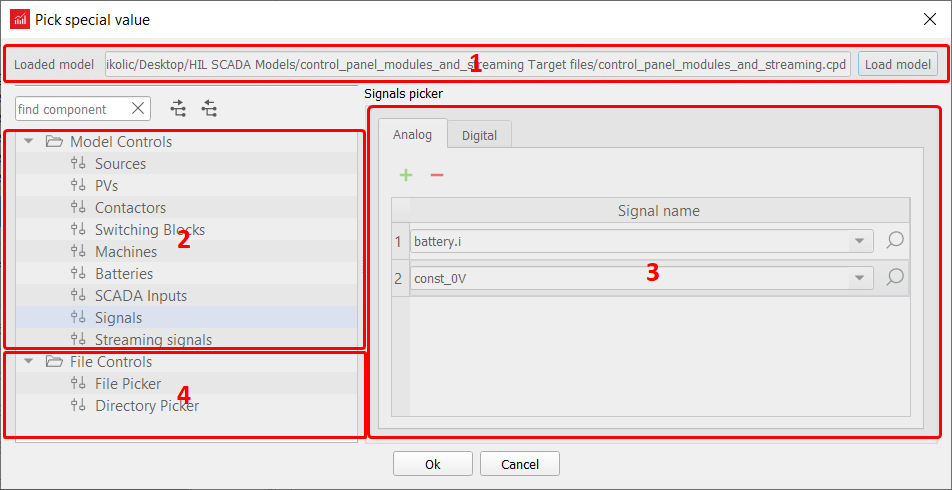 - Main picker window: Allows the user to select a given signal/scada input/machine/model info or to choose the file/directory.