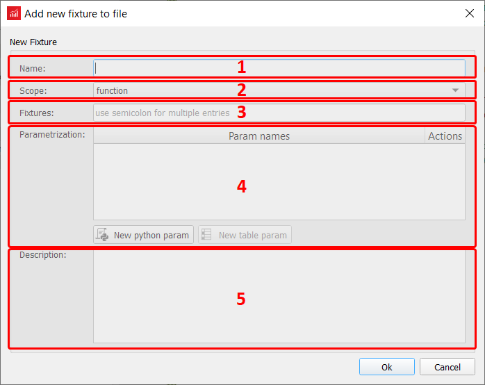 - Description - description of fixture (will be added to docstring).