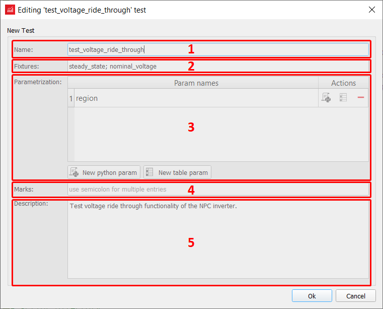 - Description - description of test case (will be added to docstring).