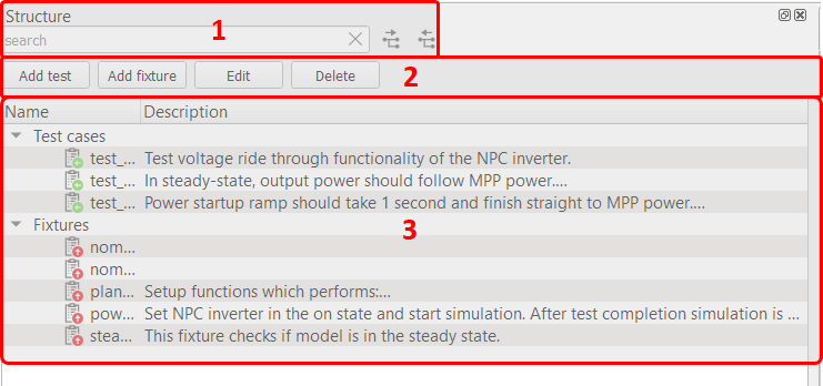 - Search section: Here user can filter the currently listed tests cases and fixtures.