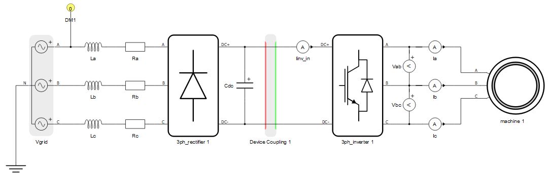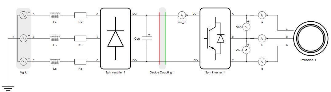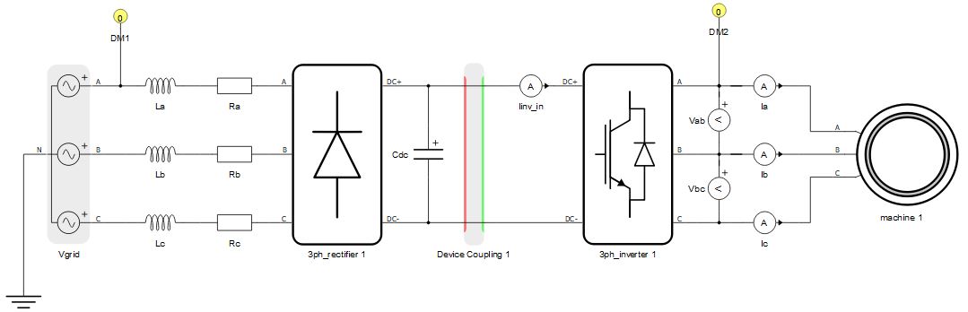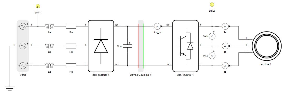 Secondly, circuits can be divided using both device couplings and core markers, which is shown in Figure 2. A device coupling is used to divide the full circuit into two separate circuits that should be emulated on two HIL devices. Device markers are used to define which part of the circuit is emulated in which HIL device. The rectifier part is marked with marker with id = 0, meaning that it is going to be emulated on the HIL device with ID 0. The inverter and the machine part of the circuit is marked with id = 1, meaning that it is going to be emulated on the HIL device with ID 1.
