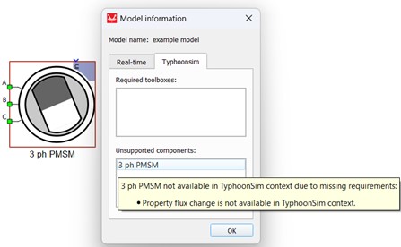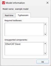 Also, in the Model information window, unsupported components and required toolboxes for the Real-time or TyphoonSim simulation contexts will be listed. For more details, please see Model information (F10) - Component level.