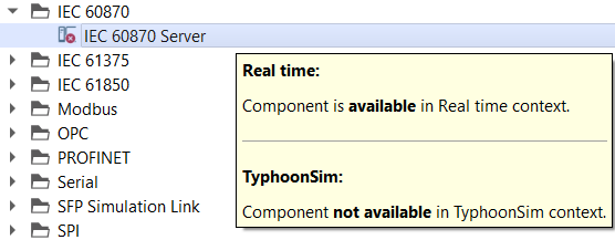 As an unsupported component example, we will use the IEC 60870 Server component. In this specific case, the IEC 60870 Server component is not available in TyphoonSim, while it is available in real-time/Virtual HIL simulation, so in Library Explorer, the following component tooltip will be displayed: