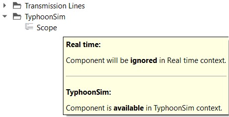 If the Integrated perspective is chosen, constraints regarding component availability in either the real-time/VHIL or TyphoonSim context will be visible in Library Explorer where corresponding icons will be displayed (see Icons indicating component/property availability).