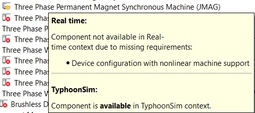 As a component with a specific context requirement example, we will use the 3 ph PMSM JMAG component. In this specific case, the 3 ph PMSM JMAG component is available in TyphoonSim, while it is available in real-time/Virtual HIL simulation if the specific hardware requirement - Device configuration with nonlinear machine support is satisfied. Besides of the specific hardware requirement, the Nonlinear Machines toolbox should be available. In this example, the user has the Nonlinear Machines toolbox available through the user license.