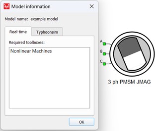 On the other hand, if the chosen HIL device configuration does support Nonlinear Machines (e.g. HIL402, configuration 6), the 3 ph PMSM JMAG component is supported and only the Nonlinear Machines toolbox will be listed under the “Required toolboxes” in the real-time perspective of the Model information window, as shown in Figure 12.