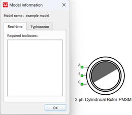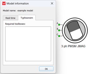 The TyphoonSim perspective window in Model information will be empty because the 3 ph PMSM JMAG component is available in TyphoonSim and no toolboxes are required, as shown in Figure 13.