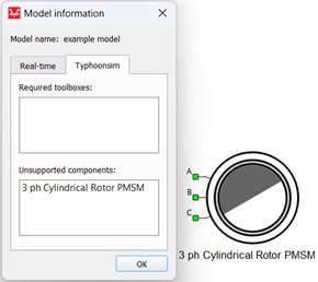 The 3 ph Cylindrical Rotor PMSM component is unsupported in TyphoonSim, while it is fully available in the real-time/Virtual HIL simulation (no required toolboxes or any other requirements).