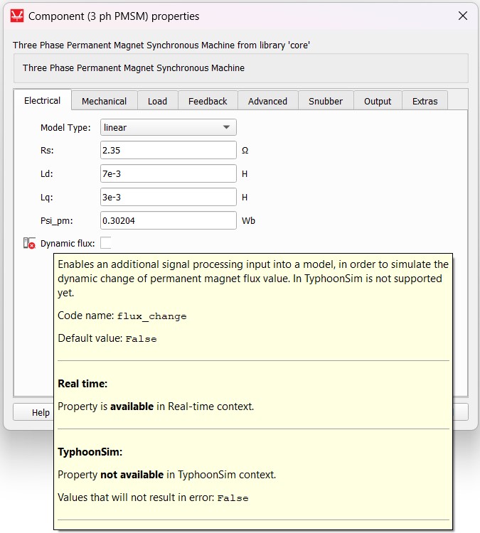 As an unsupported property example, we will use the 3 ph PMSM component Dynamic flux property. In this specific case, the Dynamic flux property is not available in TyphoonSim, while it is available in real-time/Virtual HIL simulation, so in the component’s mask, the property tooltip shown in Figure 16 will be displayed.