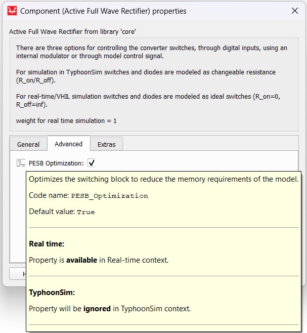 As an ignored property example, we will use the Active Full Wave Rectifier PESB Optimization property. In this specific case, the PESB Optimization property is supported in real-time/Virtual HIL simulation, while it is ignored in TyphoonSim.