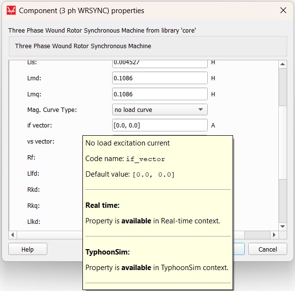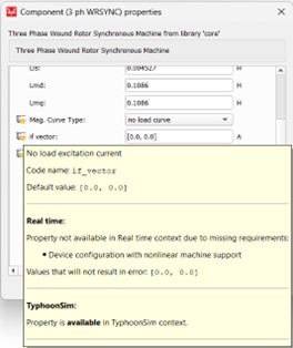 As a property with a specific context requirement example, we will use the 3 ph WRSYNC component if vector property. The if vector property is available only if the chosen machine Model type property is set to “nonlinear” and the Mag. Curve Type property is set to “no load curve”. In this specific case, the if vector property is available in TyphoonSim, while it is available in real-time/Virtual HIL simulation only if this specific requirement is satisfied.