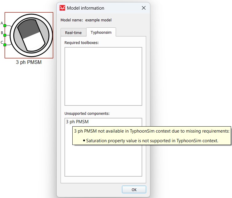 Example: Integrated perspective - 3 ph PMSM component is available, but the Dynamic flux property is not available in TyphoonSim. The default value for the Dynamic flux property is False (unchecked). If the Dynamic flux property is checked (the property value is different than the default property value), the 3 ph PMSM component will be marked as red when TyphoonSim visualization is performed and it will be listed in the TyphoonSim Unsupported components dialog in the Model information window (F10) with a tooltip explaining why the component is not supported in the corresponding simulation context, as shown in Figure 20.