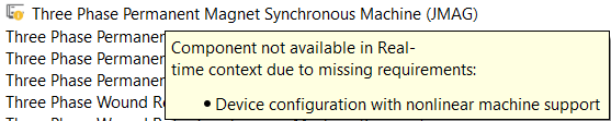 As a component with a specific real-time/VHIL context requirement example, we will use the 3 ph PMSM JMAG component. In this specific case, the 3 ph PMSM JMAG component is available in real-time/Virtual HIL simulation if the specific hardware requirement - Device configuration with nonlinear machine support is satisfied. Besides of the specific hardware requirement, the Nonlinear Machines toolbox should be available. In this example, the user has the Nonlinear Machines toolbox available through the user license.