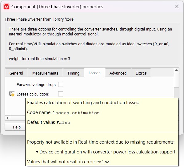 If the chosen HIL device configuration does not support converter power loss calculation (e.g. HIL402, configuration 1), the Three Phase Inverter component Losses calculation property is unavailable in real-time/VHIL due to missing requirements, so in the component’s mask, the property tooltip shown in Figure 3 will be displayed: