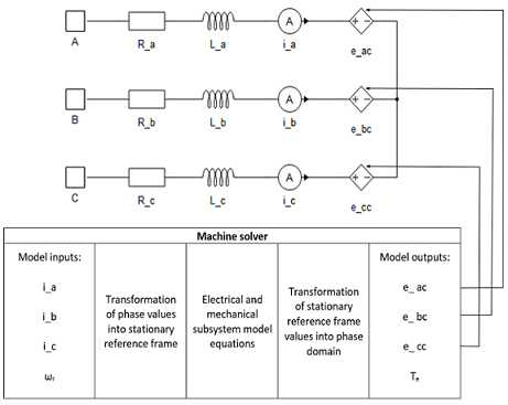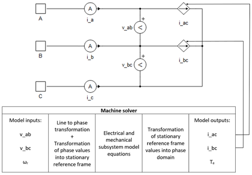 For machines with current source interface, phase voltages are sampled as inputs to the model and machine stator and (if a rotor circuit exists) rotor fluxes or currents are chosen as state variables. Machine currents are then calculated according to the machine mathematical model in either αβ0 or dq0 coordinates and are converted to the phase domain and applied to the current sources.
