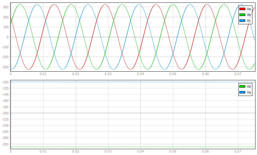 Rotating dq components of electrical variables are transformed to phase values using the inverse Park's transformation matrix in the following form:
