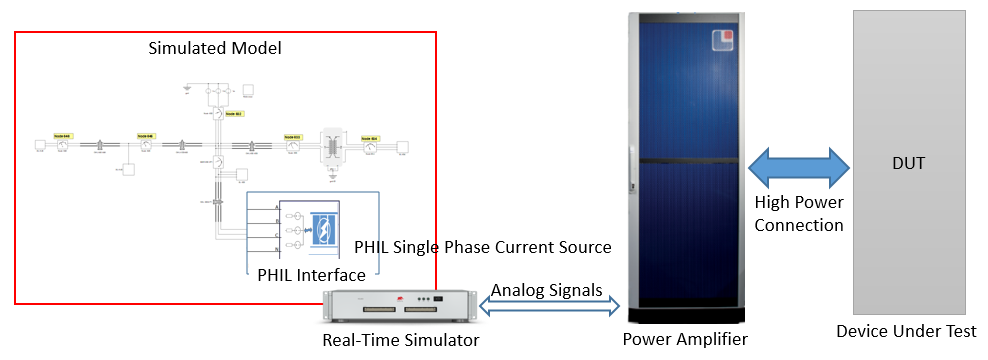 PHIL interface components are used to link the real time simulation with a real power amplifier to form a PHIL system, by means of analog input/output signals. PHIL interface components are composed of analog input controlled voltage/current sources and voltage/current measurements. In Figure 1 a typical PHIL setup is presented. It consists of a real-time simulator, a power amplifier, and a high power device under test. Depending on the purpose and function of the device under test, the power amplifier emulates either a grid or a load. The model simulated in the real-time simulator defines what exactly the power amplifier emulates. The real-time simulator is connected with the power amplifier through analog input and output signals. Through analog outputs, the real-time simulator sends the reference currents/voltages to the amplifier. These references are the results of the real-time simulation. The feedback signals from the power amplifier are used in the simulation through the analog inputs of the real-time simulator. The feedback signals are voltages or currents sensed by the power amplifier on its connection to the DUT. PHIL Interface components are used to easily select and parametrise which signals have to be sent or received from the power amplifier.