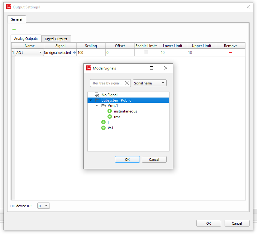 Components that have this property set to public (Figure 2) will expose their signals, regardless whether this component is contained within a locked component or not. Signal availability is demonstrated in the Initial Settings component Model Signals dialog (Figure 3). In real-time/VHIL simulation, signals are exposed in Schematic Editor and HIL SCADA. In TyphoonSim simulation, signals are exposed in TyphoonSim Scope.